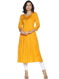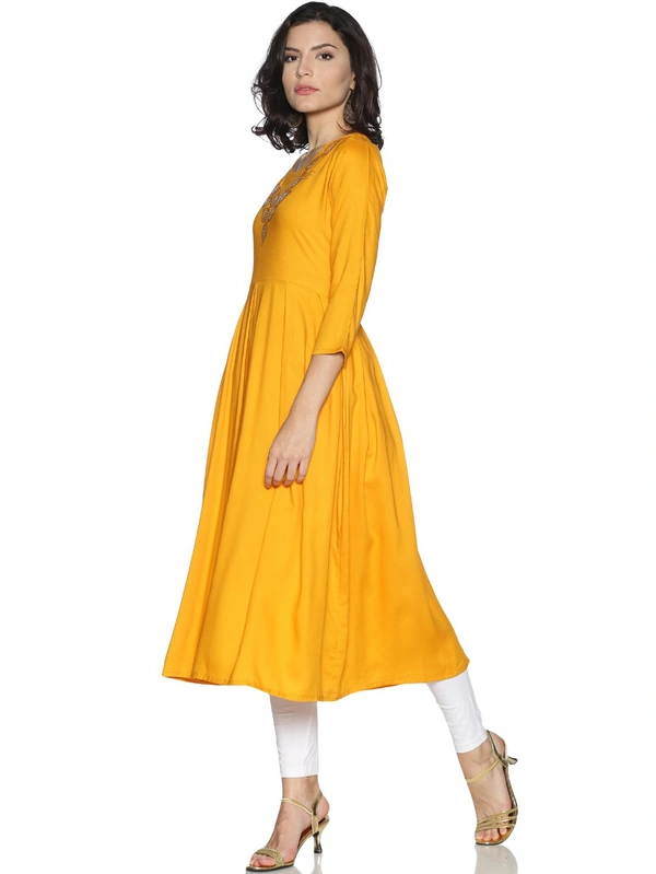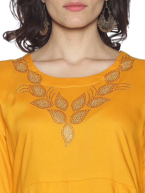 Rayon Neck Leafe Design Rhinestone Work Yellow Colour Umbrella Cut Kurti